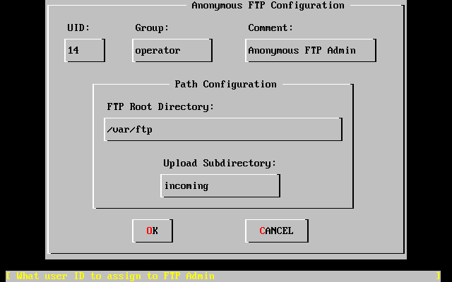 To allow anonymous FTP, use the arrow keys to select [ Yes ] and press Enter. The following screen (or similar) will display: