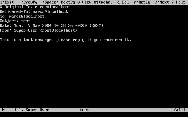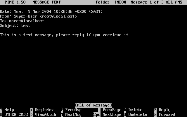 & t 1 Message 1: From root@localhost Mon Mar 8 14:05:52 2004 X-Original-To: marcs@localhost Delivered-To: marcs@localhost To: marcs@localhost Subject: test Date: Mon, 8 Mar 2004 14:05:52 +0200 (SAST) From: root@localhost (Charlie Root) This is a test message, please reply if you receive it.
