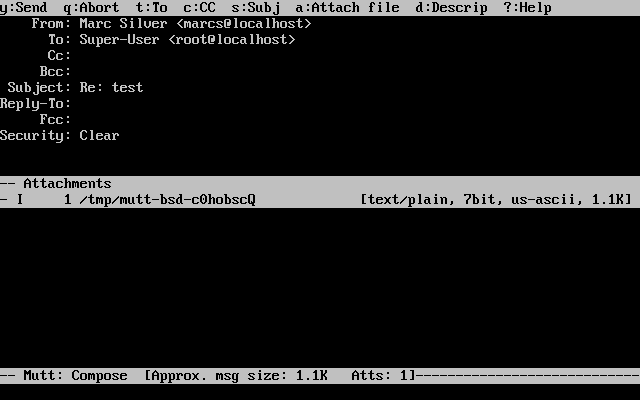 Note : Comme indiqué précédemment, la commande mail(1) à l'origine n'a pas été conçue pour gérer les pièces jointes, et par conséquent ne s'en sort pas très bien à ce niveau. Les MUAs plus récents comme mutt gérent les pièces jointes de manière plus intelligente. Mais si vous souhaitez toujours utiliser mail, le logiciel porté converters/mpack vous sera d'une grande aide.