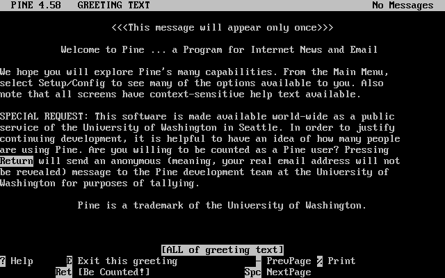 Lors du premier lancement de pine, ce dernier affiche une page de présentation avec une brève introduction, ainsi qu'un message de la part de l'équipe de développement de pine demandant l'envoi d'un courrier électronique anonyme pour leur permettre d'évaluer le nombre d'utilisateurs de leur client de messagerie. Pour envoyer ce courrier anonyme, appuyez sur Entrée, ou sinon appuyez sur E pour quitter la présentation sans envoyer de message anonyme. Un exemple de page de présentation peut être vu ci-dessous: