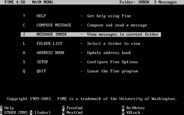Le menu principal est ensuite affiché, menu dans lequel il est aisé de naviguer avec les touches fléchées. Ce menu principal fournit les raccourcis pour la rédaction de nouveaux messages, la navigation dans les répertoires de messages, et même la gestion des entrées du carnet d'adresses. Sous le menu principal, les raccourcis clavier correspondants pour effectuer les différentes tâches sont donnés.
