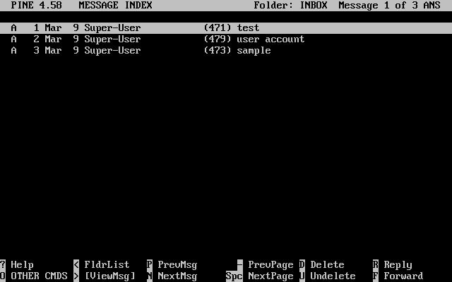 Mail version 8.1 6/6/93. Type ? for help. "/var/mail/marcs": 3 messages 3 new >N 1 root@localhost Mon Mar 8 14:05 14/510 "test" N 2 root@localhost Mon Mar 8 14:05 14/509 "user account" N 3 root@localhost Mon Mar 8 14:05 14/509 "sample"