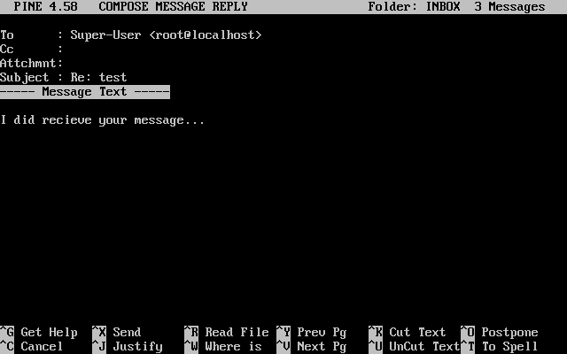 & mail root@localhost Subject: I mastered mail Now I can send and receive email using mail ... :) . EOT